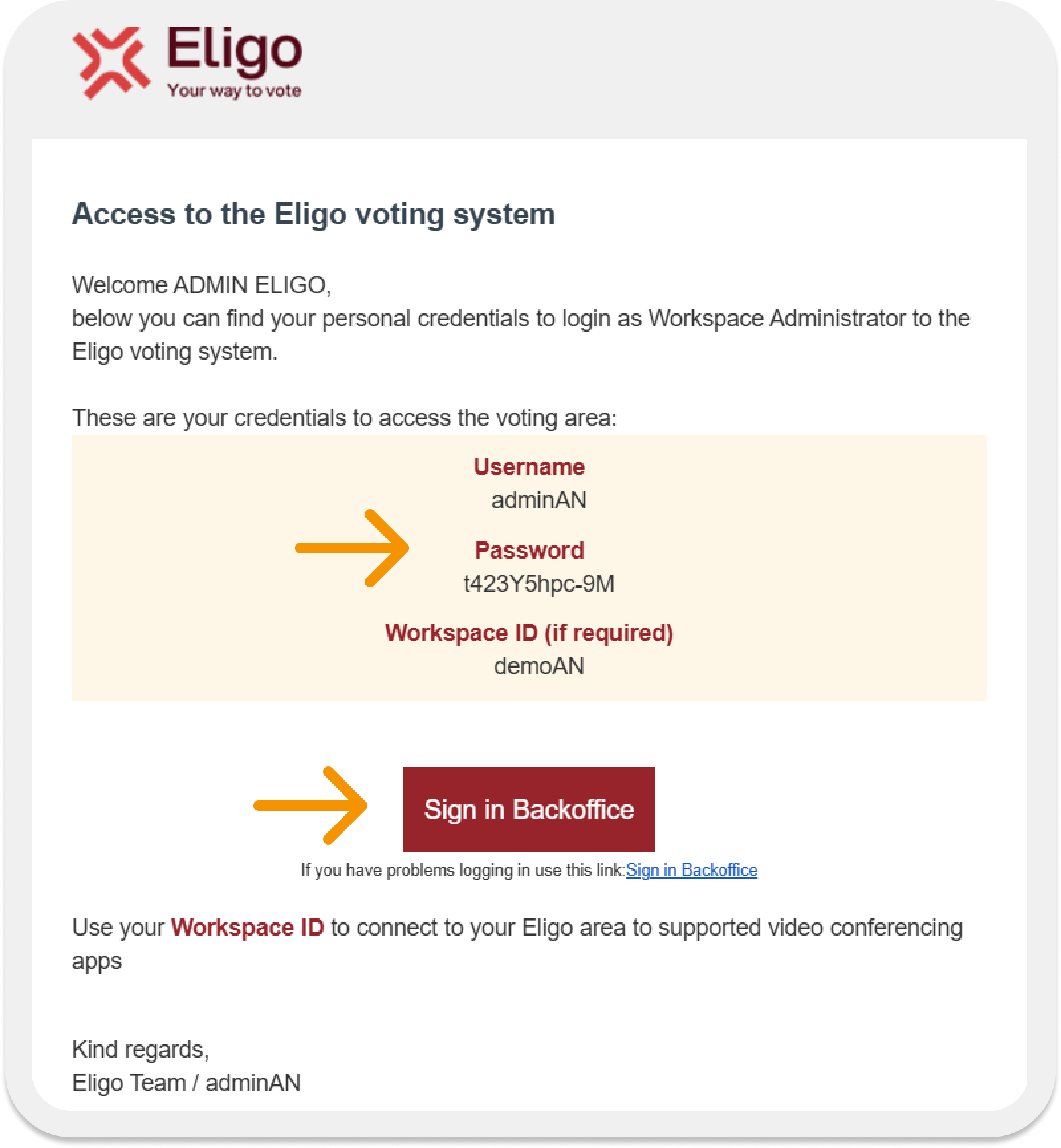 On your voting area activation, you will receive credentials to access the platform's backoffice to manage your elections.