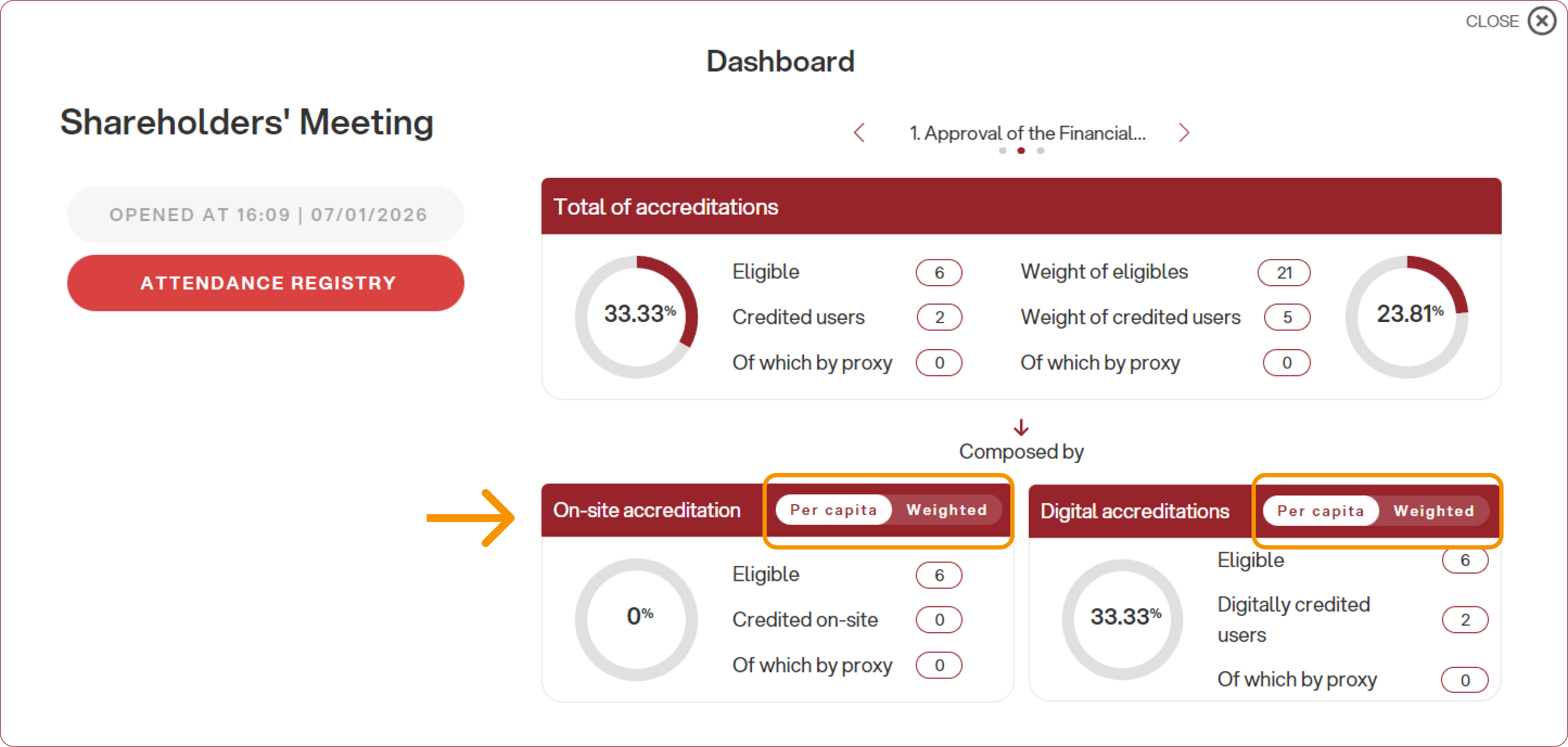 The main difference lies in the management of quorums and in the data displayed in the management dashboard, which takes into account the dual nature of the vote (numerical and weighted).
