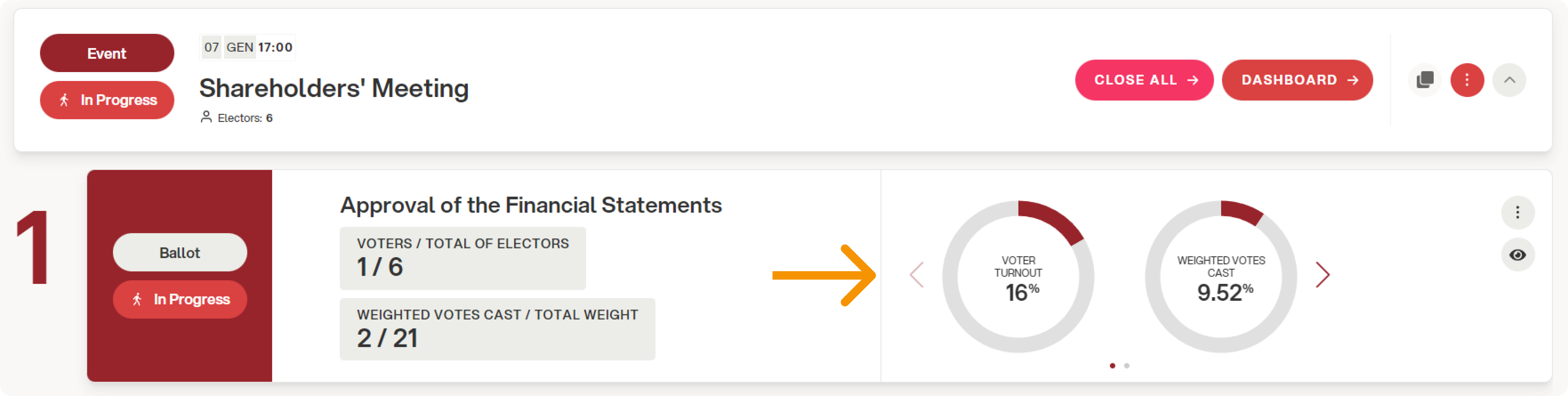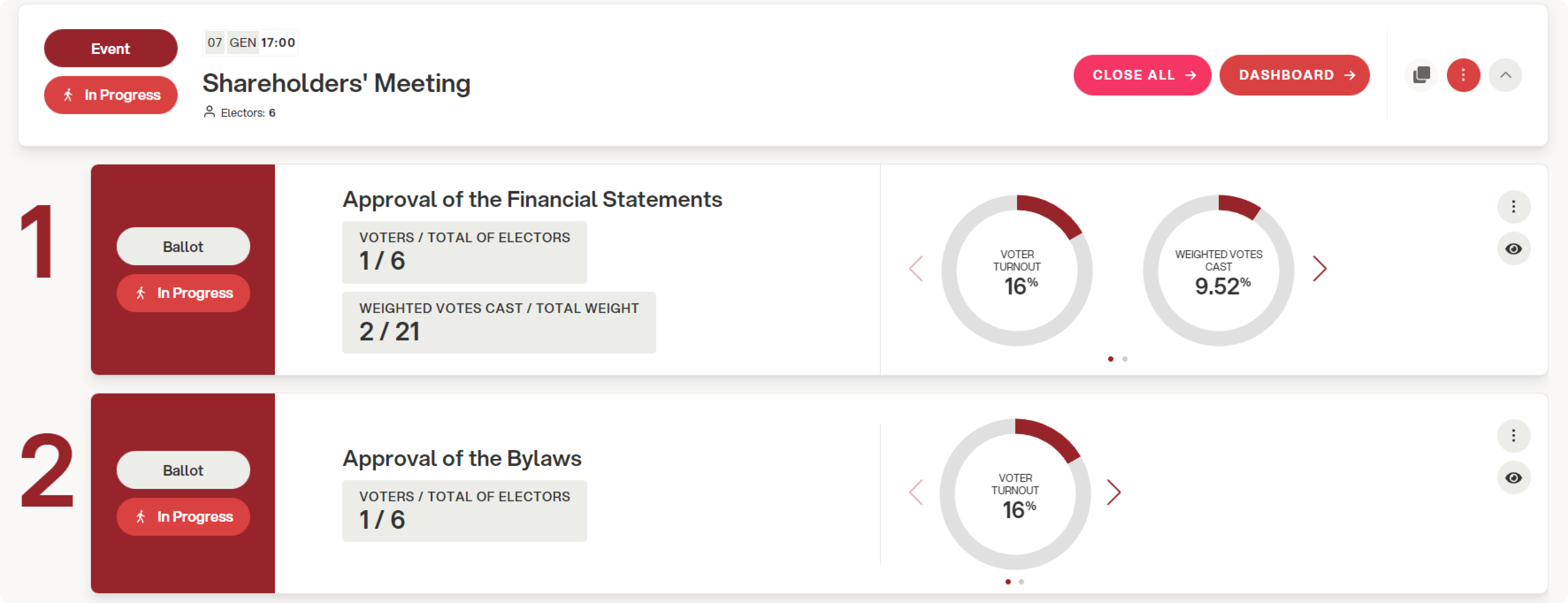 This dual view is available both for monitoring attendance at the assembly and for monitoring voting turnout.