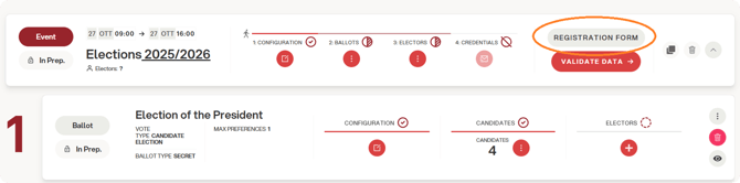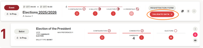 After both the electoral event and the configuration page are ready, it is possible to click on VALIDATE DATA. From this moment on, it will be possible to start registering.