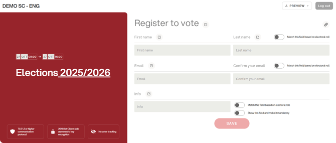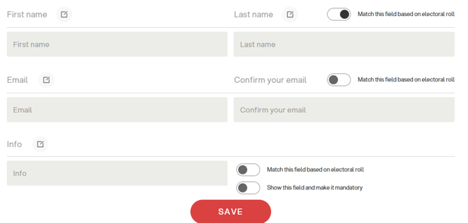 It is possible to make the First Name and Last Name, Email, and Info fields verifiable. In the latter case, Eligo checks that the pre-loaded data matches the data entered by the registering user, and, if they do not match, the users will be added as new voters.