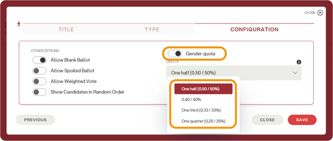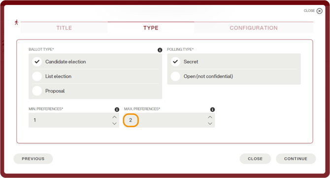 In the ballot “type”, select a “candidate” vote and choose the maximum number of preferences (to enable gender parity, generally at least 2 maximum preferences are required).