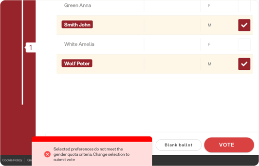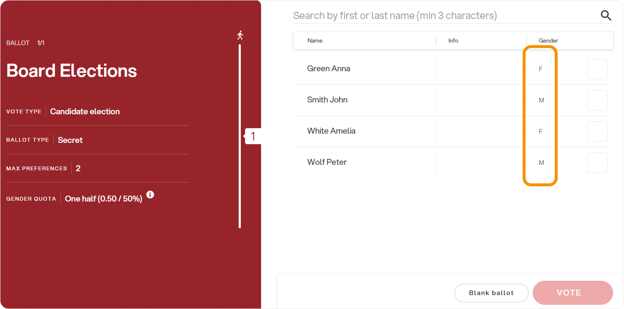 While the vote is in progress, the voter can see the gender representation information on the left side of the ballot, while on the right side there is a column indicating the candidate’s gender.