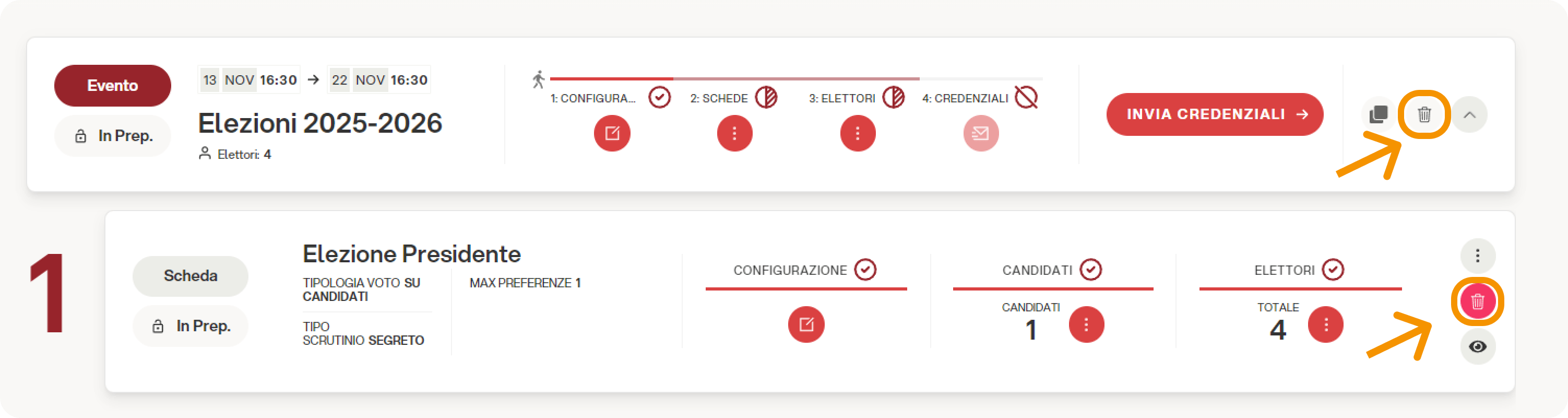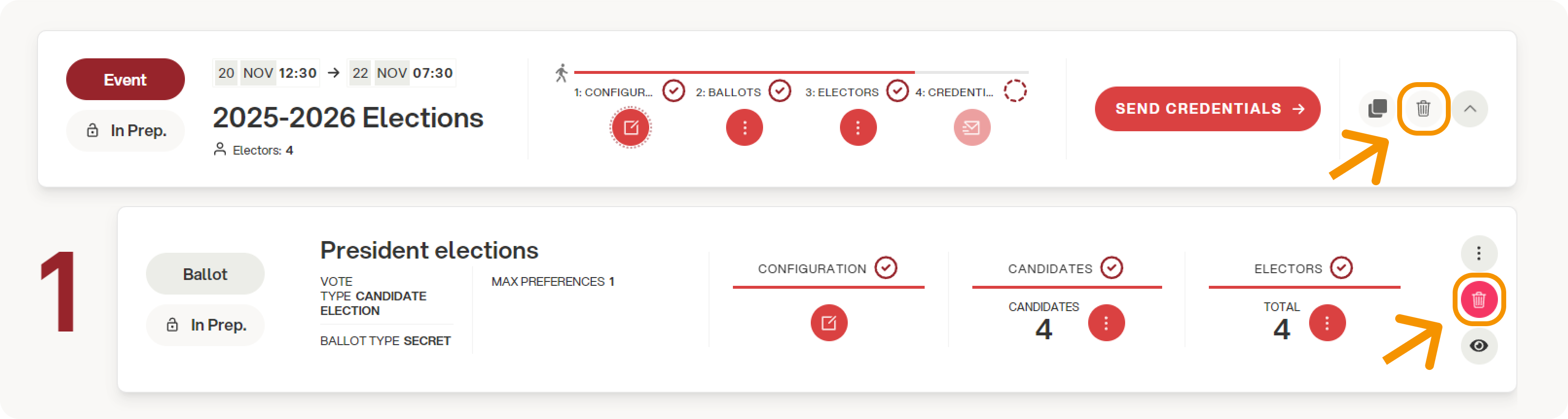 If the credentials have already been sent, it is not possible to delete a voting event, but you can archive it so that it is no longer visible in the list.
