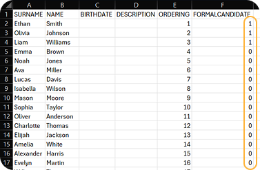 Fill out the candidate Excel file by entering all the required data. Under the field "Formal Candidate", enter 1 if the candidate should be visible in the list and 0 for non-visible eligible voters.