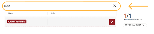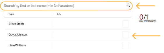 By entering at least 3 characters of the name or surname of one of the eligible voters in the bar, the voter will be able to view those whose name contains those characters and select a preference.