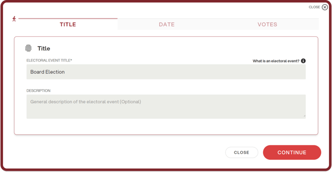 The first section must be filled in with the title of the electoral event (required) and a description (optional).