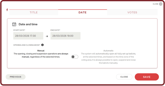 If the dedicated module has been enabled, you can also choose whether to open voting in manual mode - therefore opening voting manually - or in automatic mode. In the latter case, voting will open automatically at the selected time, but it will still be possible to manually control the opening and closing operations.