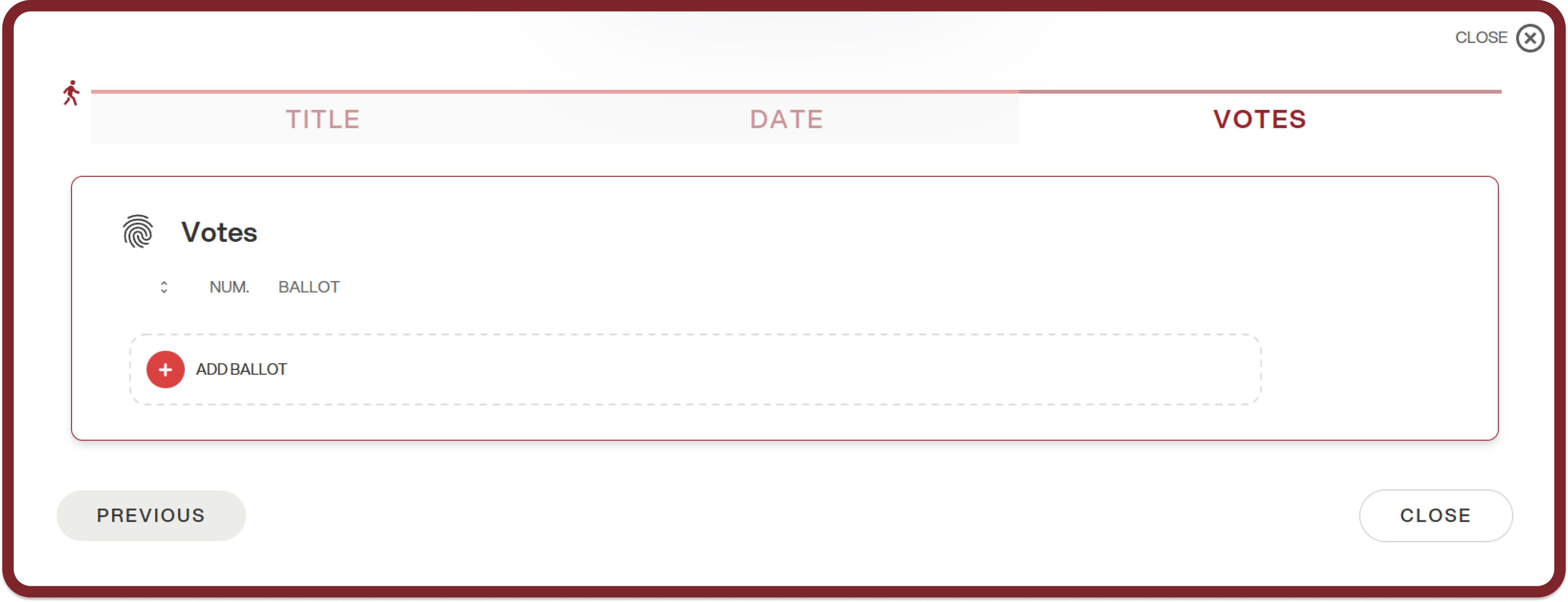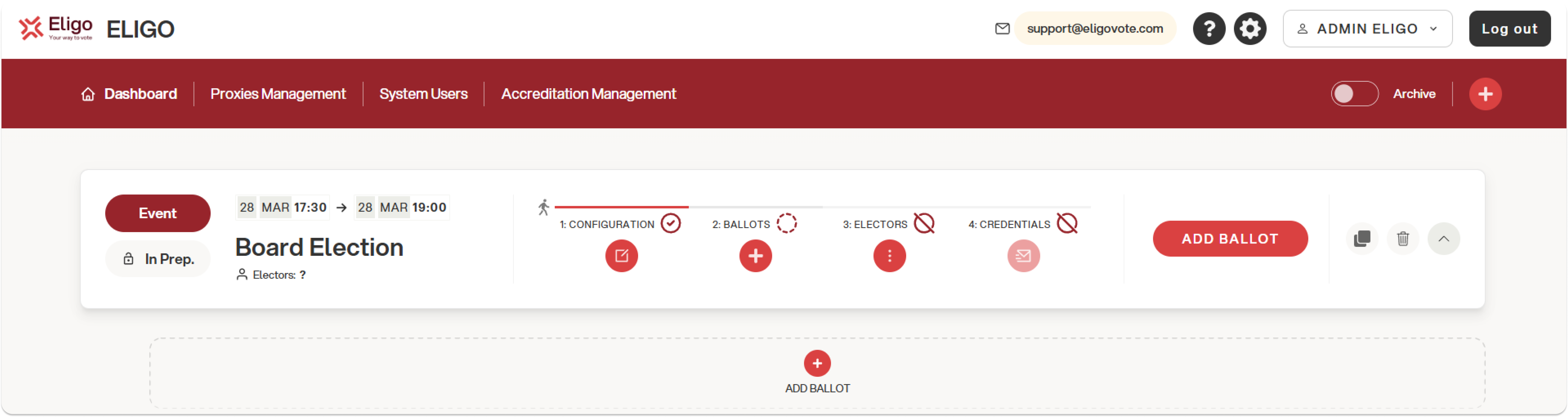 You can add ballots immediately after creating the electoral event, in the third section of the window, by clicking “+ Add ballot” and following the wizard.