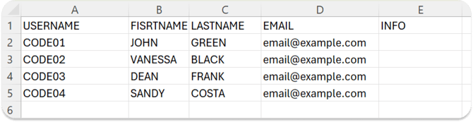- The “info” column, being optional, must not be deleted if not filled in, but left empty;