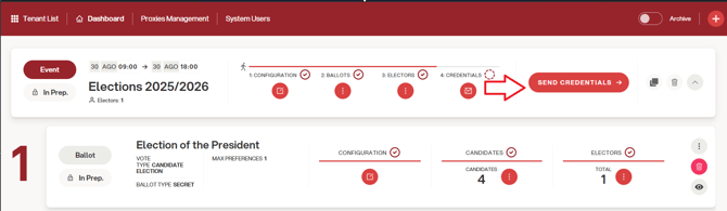 After completing the configuration of an election event, the final step before opening is sending the credentials. This step is crucial because, in addition to sending voting credentials to voters, it allows us to definitively confirm all the configurations and settings that have been entered.