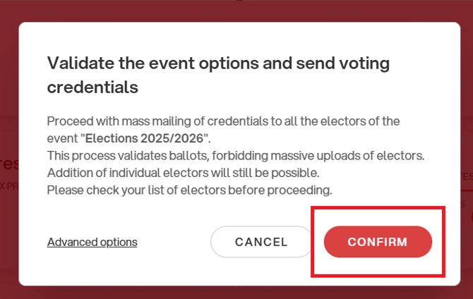 By clicking the "Confirm" button on the right, the credentials (or direct access link, depending on your area's settings) will be sent. At this point, voters will receive the email to access the voting area.
