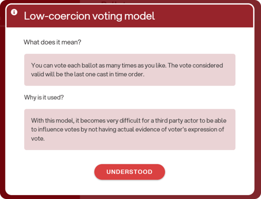 When logging in, the voter sees an informational pop-up indicating that the low-coercion module is active.