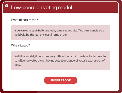 After clicking “Revoke your vote”, the voter must confirm by accepting the informational pop-up and selecting “Understood”: