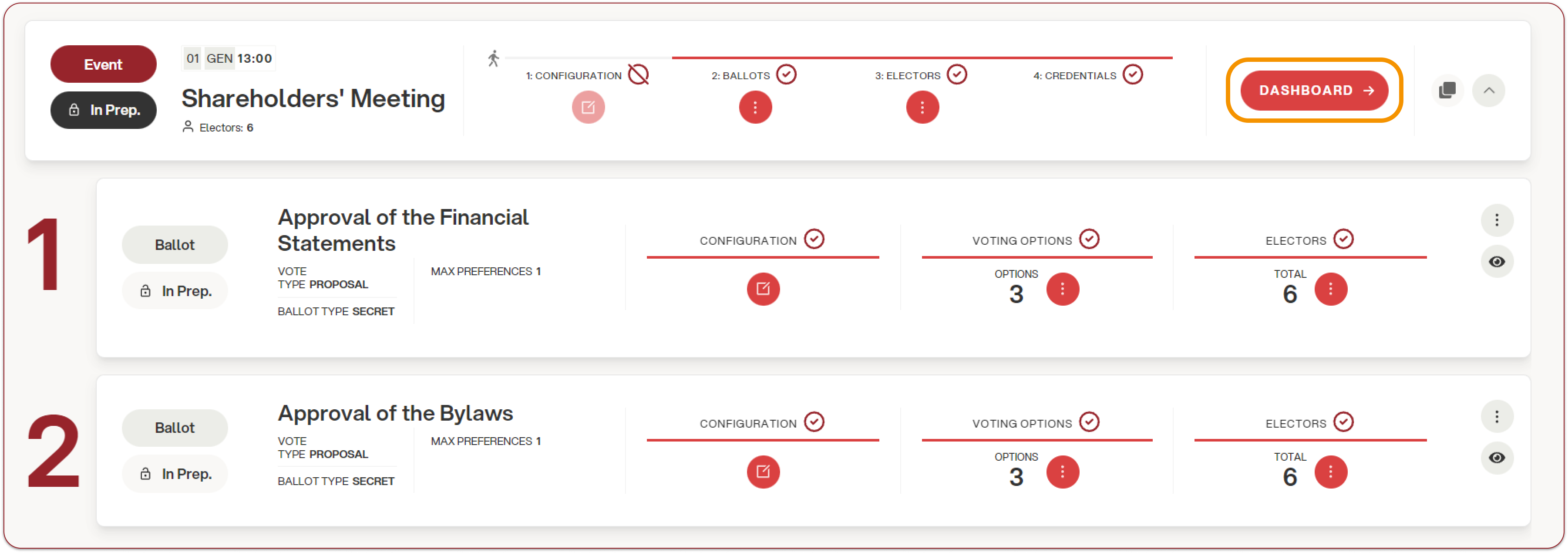 If the assembly module is active, after the event has been validated, the “Dashboard” button will appear.