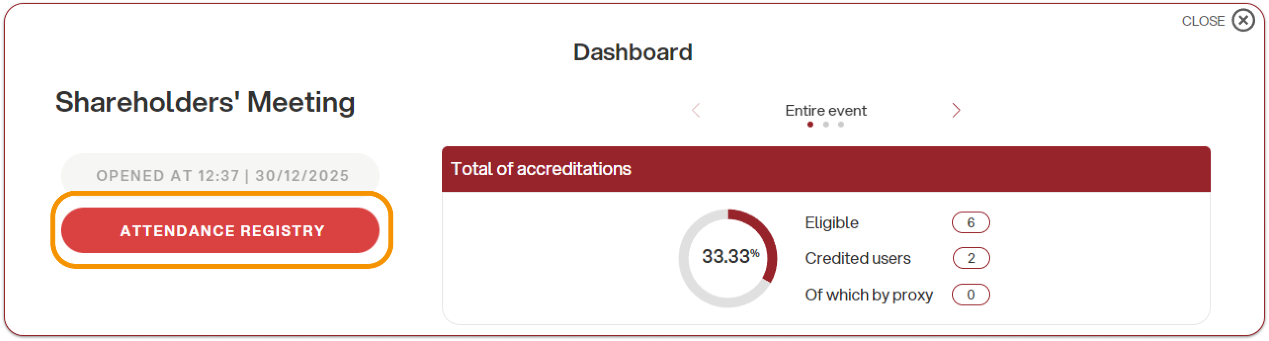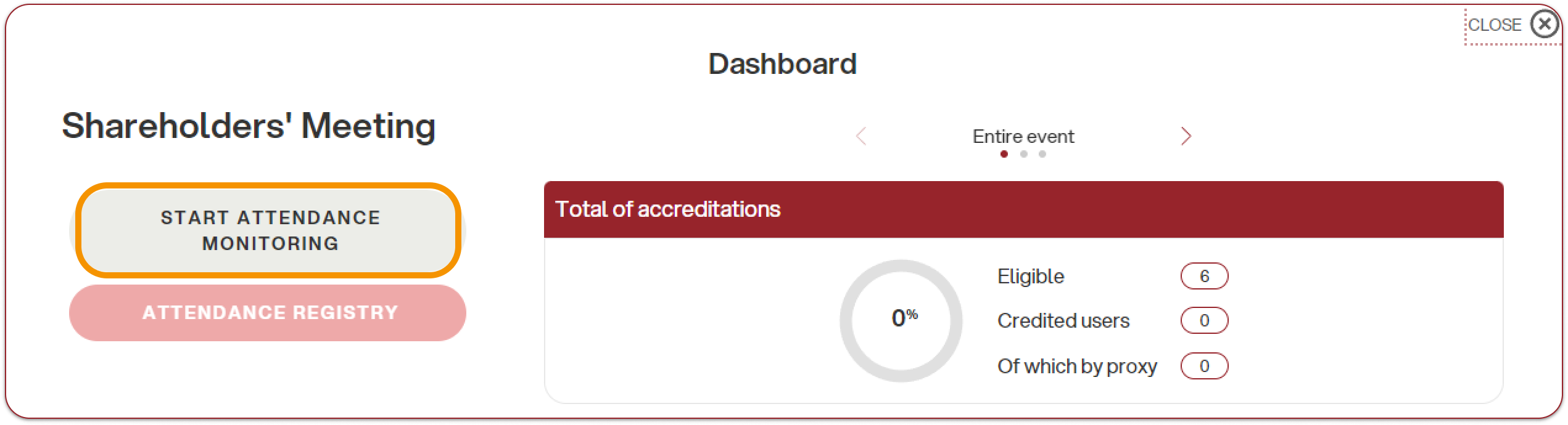 “Start attendance monitoring”: this button allows you to start tracking connected users. From this moment on, every time a user logs in and is present in the event, the counter will be updated with the number of participants online and the related proxies.