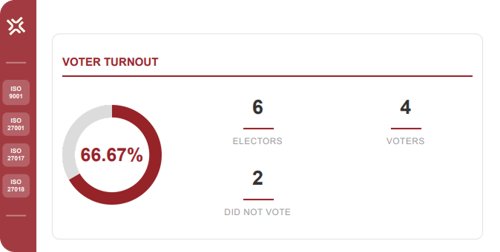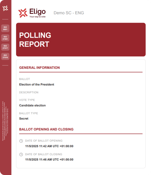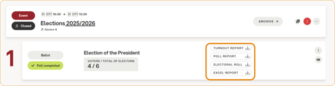 Once the voting is closed and the the results have been processed, the platform displays the summary screen from which the various reports can be downloaded.