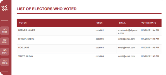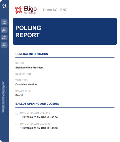 The Turnout Report is the only report available before the voting count begins: using the participation data updated at the time the polls close, the organization can assess whether the required quorum has been reached and decide whether to proceed with the count or, if necessary, repeat the vote.