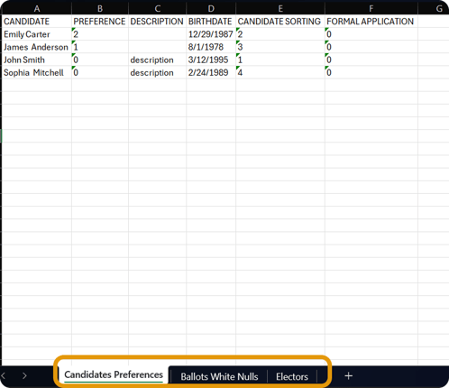 In the case of an open vote, an additional sheet will contain a table of the individual preferences cast by the voters.