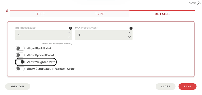 First, turn on the "Allow Weighted Vote" option in the DETAILS section of the ballot configuration menu:
