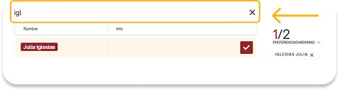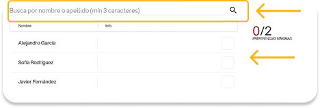 Al introducir al menos 3 caracteres del nombre o apellido de uno de los elegibles en la barra, el elector podrá visualizar a quienes presenten esos caracteres en el nombre completo y seleccionar una preferencia.