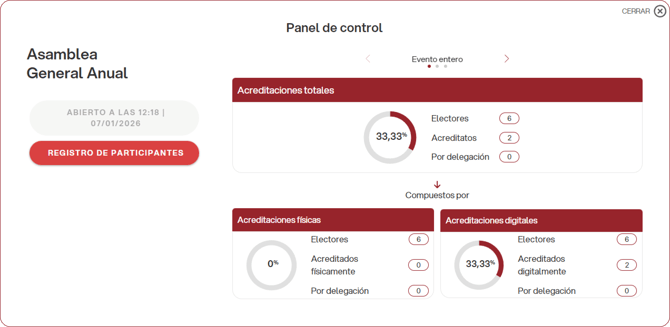 La participación puede monitorizarse tanto sobre el total de electores con derecho a voto como sobre los acreditados, haciendo clic en las flechas situadas junto al contador.