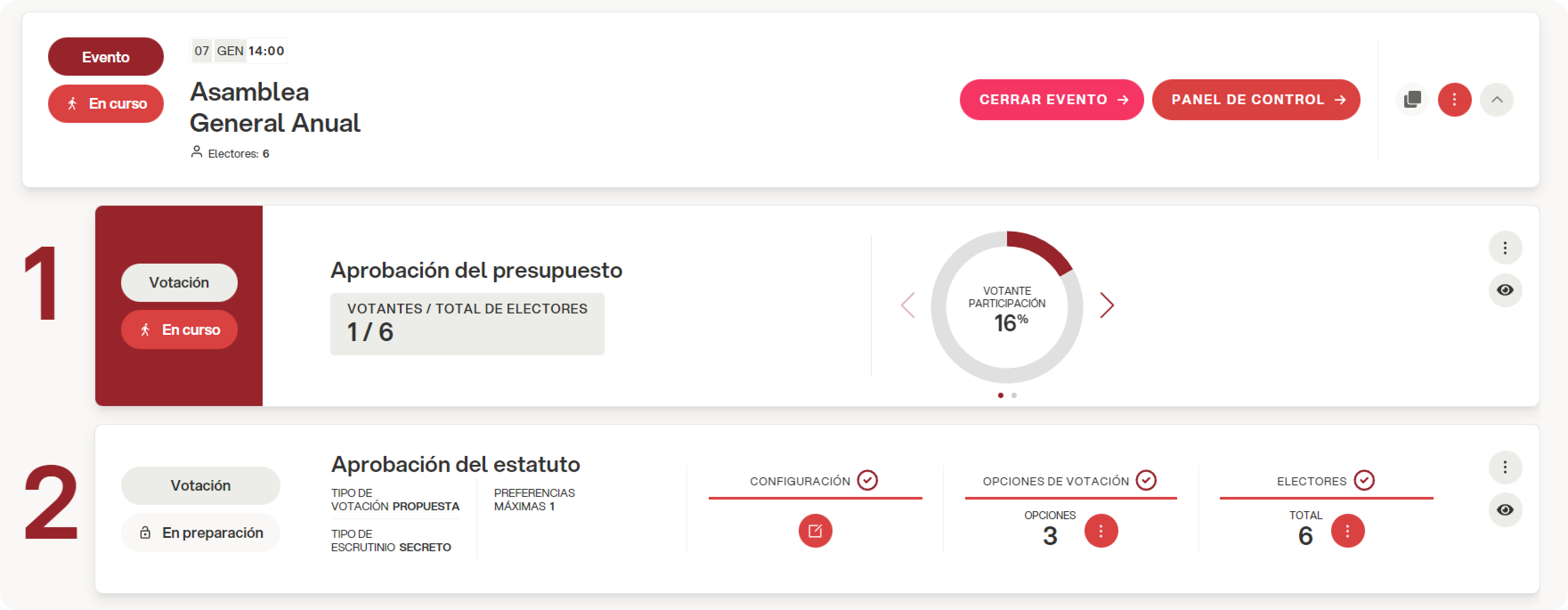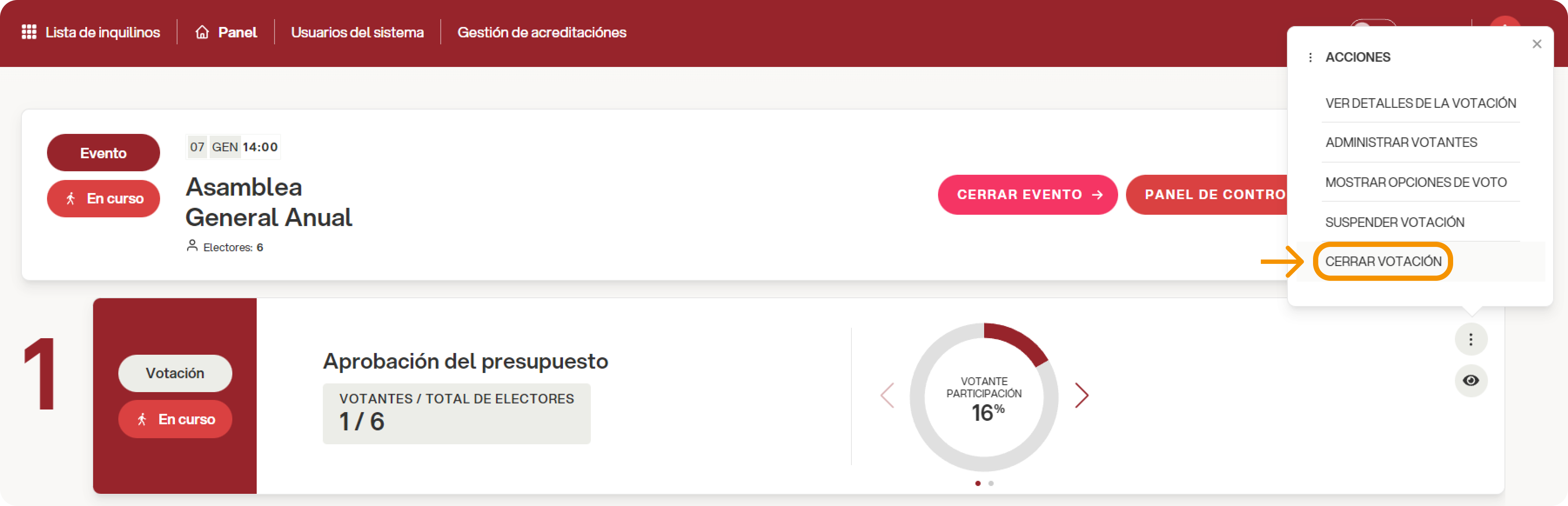 Las votaciones pueden cerrarse de forma masiva mediante el botón “Cerrar evento” o de manera individual mediante la opción “Cerrar votación” desde el menú desplegable de la papeleta.