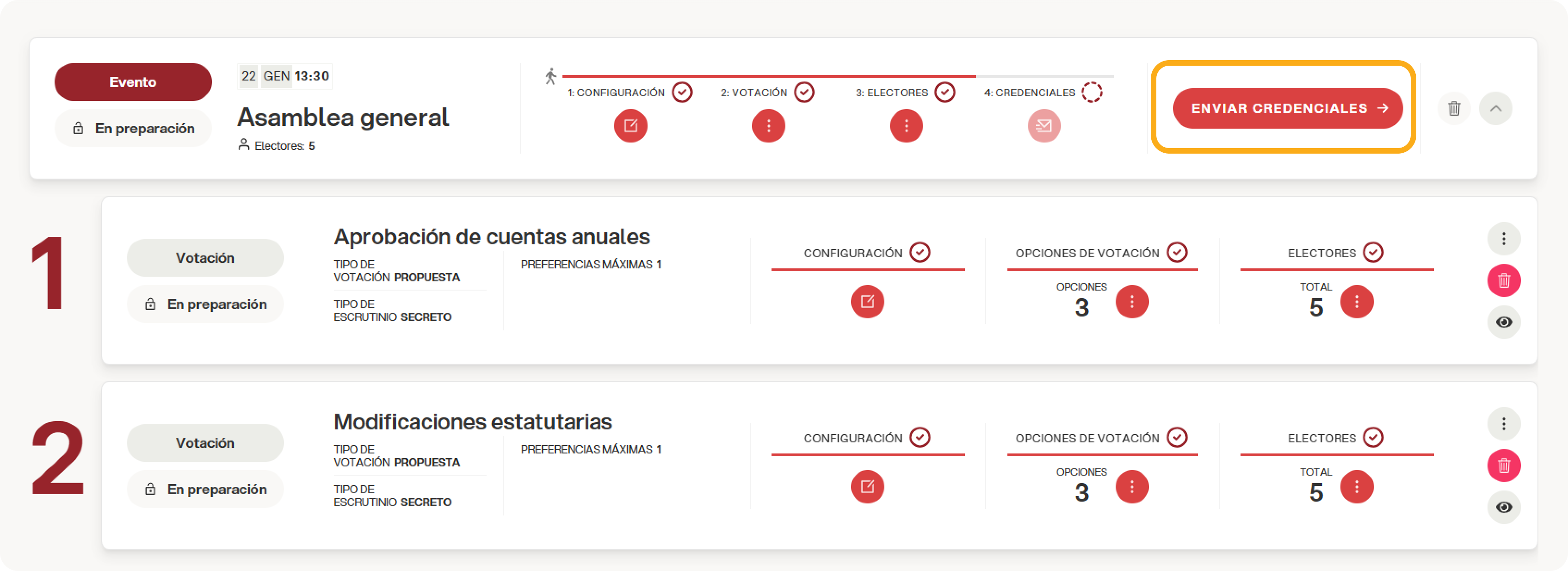 Al hacer clic en el botón "Confirmar" a la derecha, se enviarán las credenciales (o el enlace de acceso directo, según la configuración de tu área). En ese momento, los votantes recibirán el correo electrónico para acceder al área de votación.