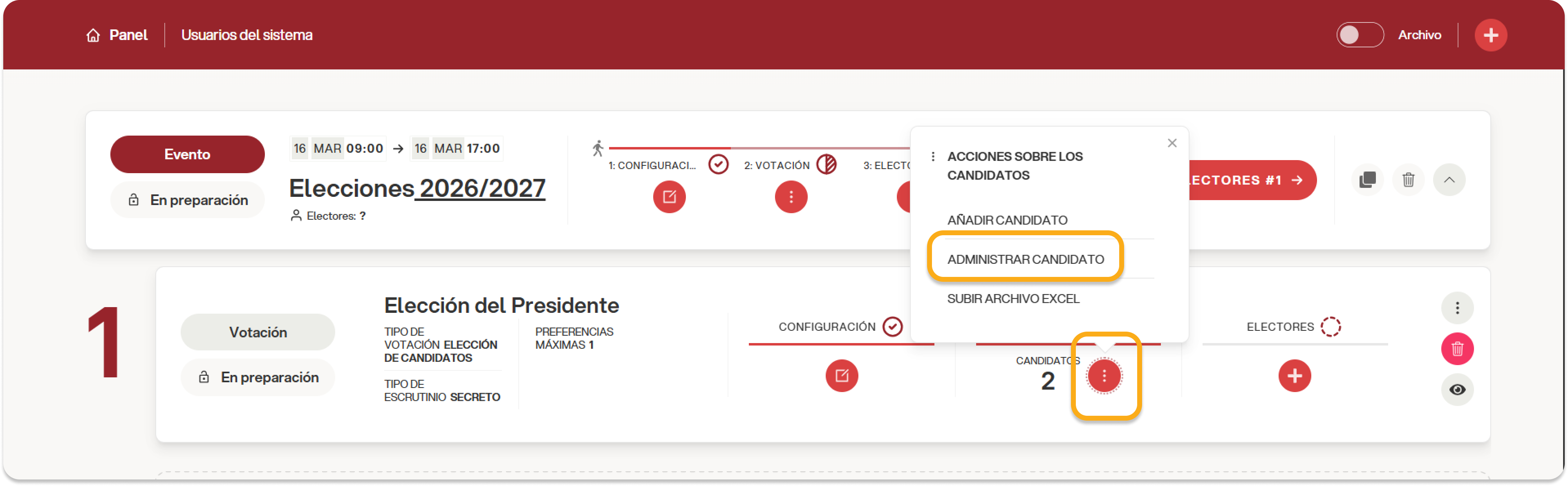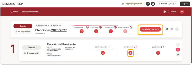 En el panel de control del área de voto, es posible añadir candidatos a una papeleta haciendo clic indistintamente en el botón "+ Candidatos" de la sección de resumen de la papeleta, o en el botón "Candidatos #1", si está presente, a la derecha de la sección de resumen del evento electoral correspondiente: