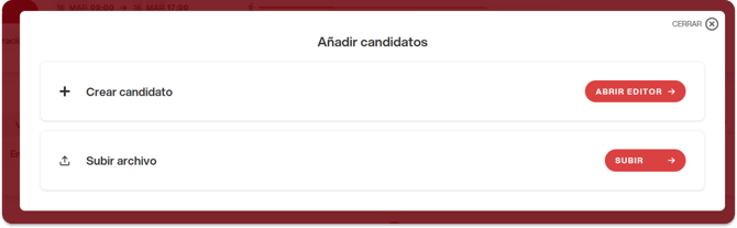 Se abrirá la pantalla de introducción de candidatos, donde podrá elegir entre introducir los candidatos manualmente o cargar un archivo Excel: