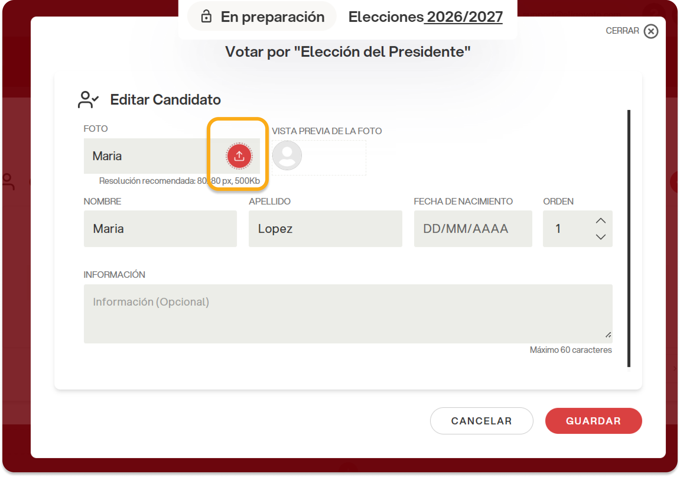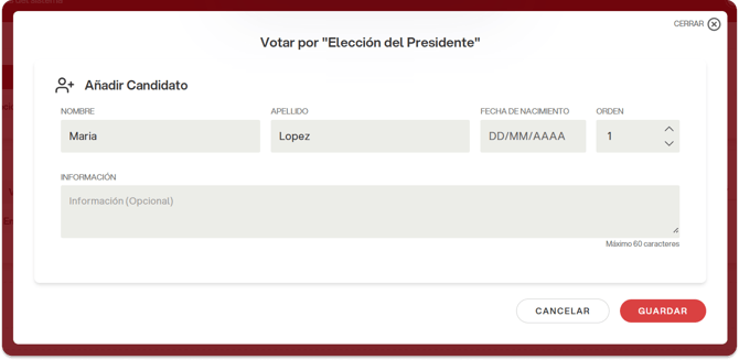 • Orden: campo obligatorio que determina el orden de aparición de los candidatos. Si se establece en 0, los candidatos se mostrarán en orden alfabético por apellido. Si hay candidatos con ordenación distinta de 0 e igual a 0, los candidatos con ordenación 0 se mostrarán después de los candidatos con ordenación distinta de 0.