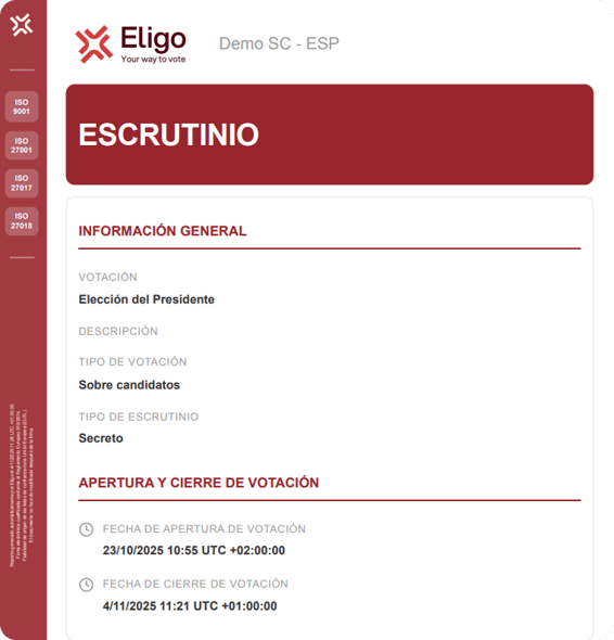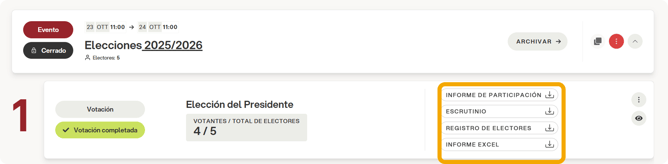 Una vez finalizada la votación y generado el escrutinio, la plataforma muestra la pantalla de resumen desde la que es posible descargar los diferentes informes de escrutinio.