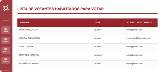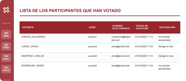Electores – lista completa de las personas con derecho a voto, con información sobre fecha y hora de voto, eventuales delegaciones asignadas o peso del voto.