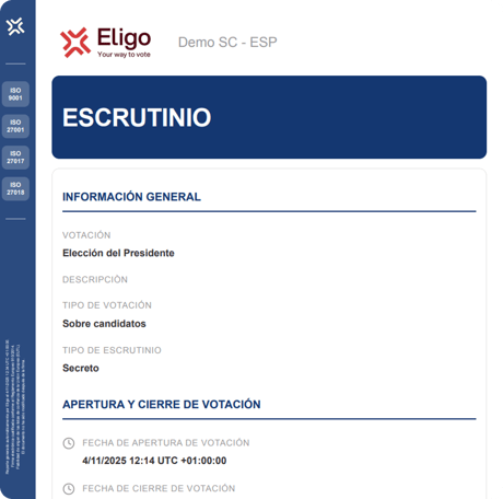 El Informe de Participación es el único disponible antes de la generación del escrutinio: a través de los datos de participación actualizados al momento del cierre de la votación, la organización puede evaluar si se ha alcanzado el quorum previsto y decidir si se procede con el escrutinio o, si es necesario, repetir la votación.