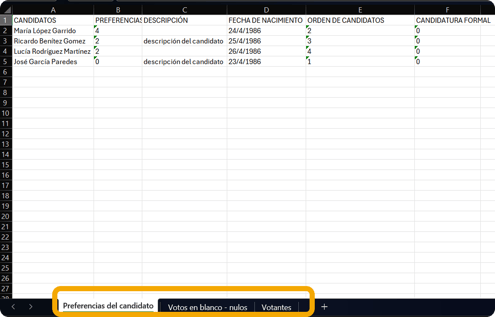 En el caso de votaciones abiertas habrá una hoja adicional con la tabla de las preferencias individuales expresadas por los votantes.