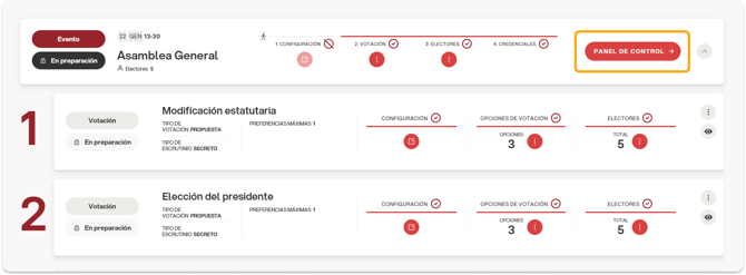 Si el módulo de asamblea está activo, tras la validación del evento, aparecerá el botón "Panel de Control":