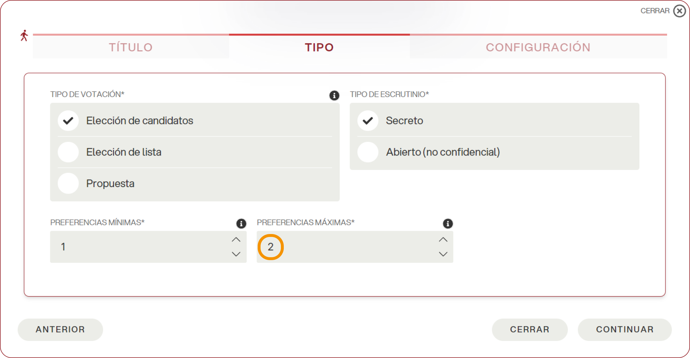 En la tipología de la papeleta, seleccionar la votación “por candidatos” y definir el número máximo de preferencias (para habilitar la paridad de género, por lo general es necesario tener al menos 2 preferencias máximas).