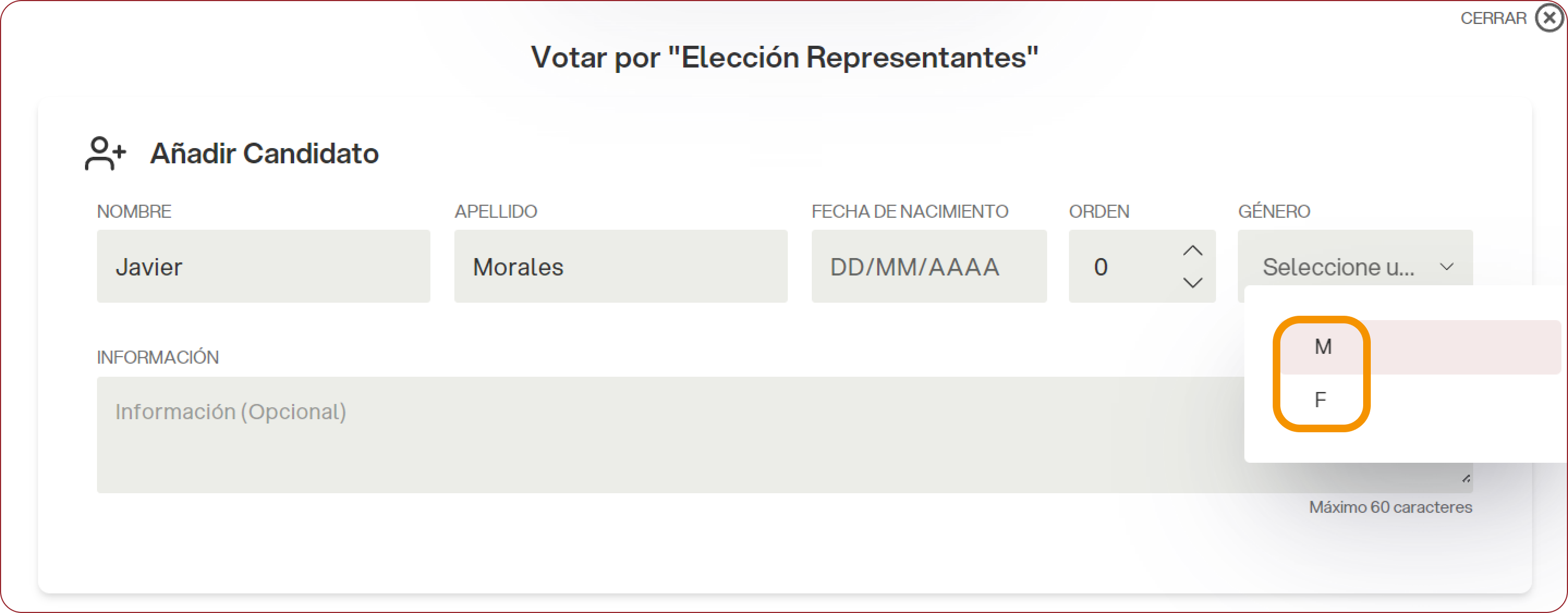En el momento de la carga de los candidatos, seleccionar el género en el menú correspondiente.