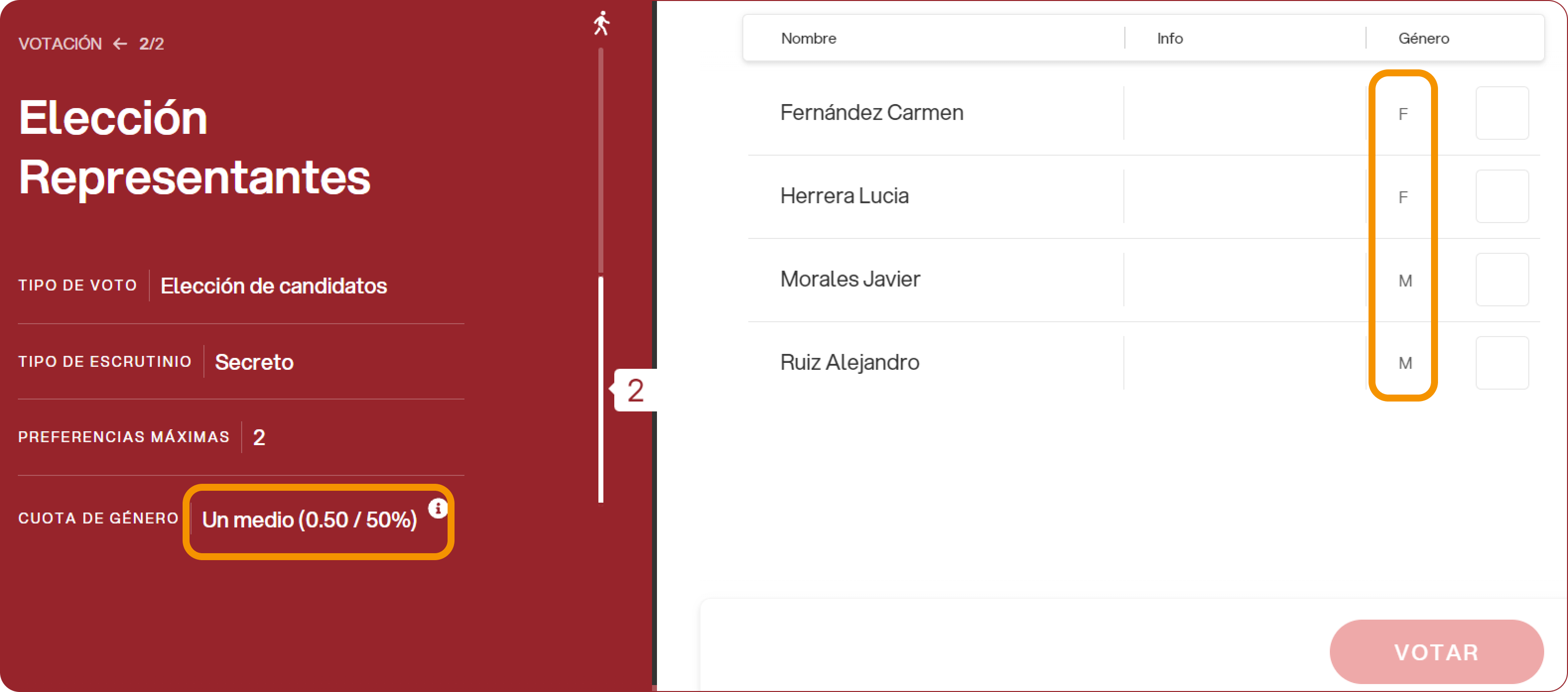 Con la votación en curso, el elector puede visualizar, a la izquierda de la papeleta, la información sobre la representación de género, mientras que a la derecha aparece una columna que indica el género de cada candidato/a.