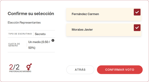 Si la representación de género se respeta, el sistema mostrará normalmente la pantalla para continuar con la confirmación del voto.