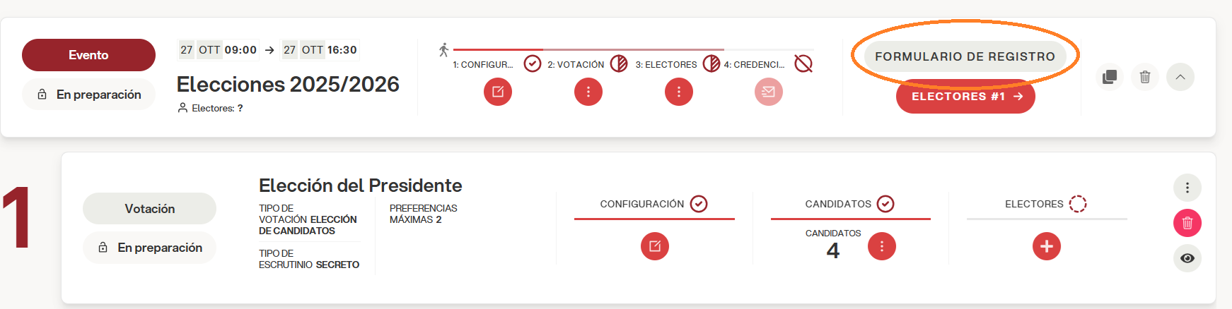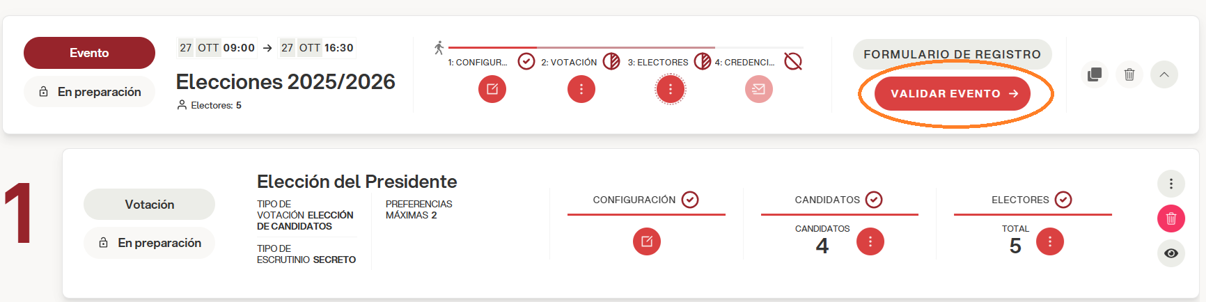 Una vez que tanto el evento electoral como la página de configuración estén listos, es posible hacer clic en VALIDAR EVENTO. A partir de este momento, será posible comenzar a registrarse.