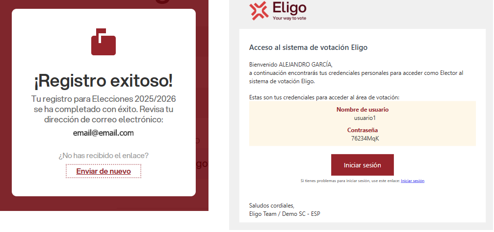 Recibirá un mensaje de confirmación, y al mismo tiempo se enviarán las credenciales para acceder a la votación al correo electrónico comunicado durante la fase de registro.