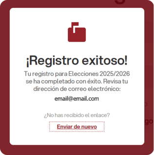 Recibirá un mensaje de confirmación, y al mismo tiempo se enviarán las credenciales para acceder a la votación al correo electrónico comunicado durante la fase de registro.