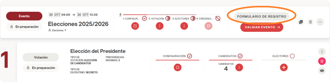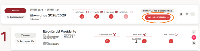 Una vez que tanto el evento electoral como la página de configuración estén listos, es posible hacer clic en VALIDAR EVENTO. A partir de este momento, será posible comenzar a registrarse.