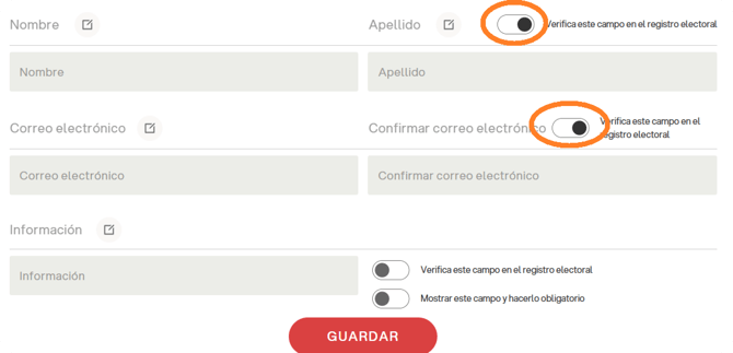 Es posible hacer verificables los campos de Nombre y Apellido, Correo Electrónico (Email) e Info. En este último caso, Eligo comprueba que los datos precargados coincidan con los introducidos por el usuario que se registra, y, en caso de que no coincidan, los usuarios serían insertados como nuevos votantes.