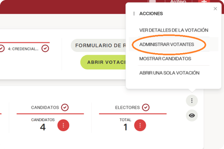 Desde este punto es posible gestionar la votación en sí, pudiéndola abrir, suspender, cerrar y escrutar, teniendo en cuenta que el proceso de registro estará abierto hasta el cierre del evento electoral.