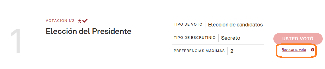 La votación se desarrolla normalmente, pero después de confirmar el voto, aparece en la pantalla inicial una opción para realizar la revocación del voto.