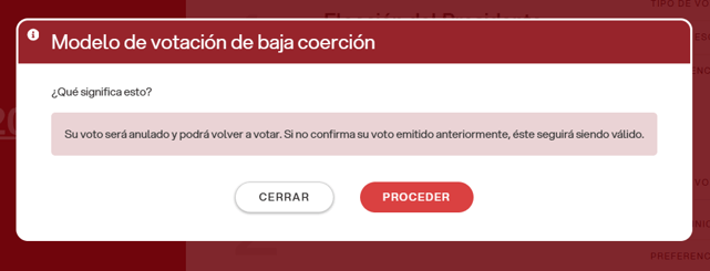 El voto de baja coerción es un modelo diseñado para reducir al mínimo la posibilidad de que un votante sea influenciado, controlado o coaccionado durante la expresión de su voto.