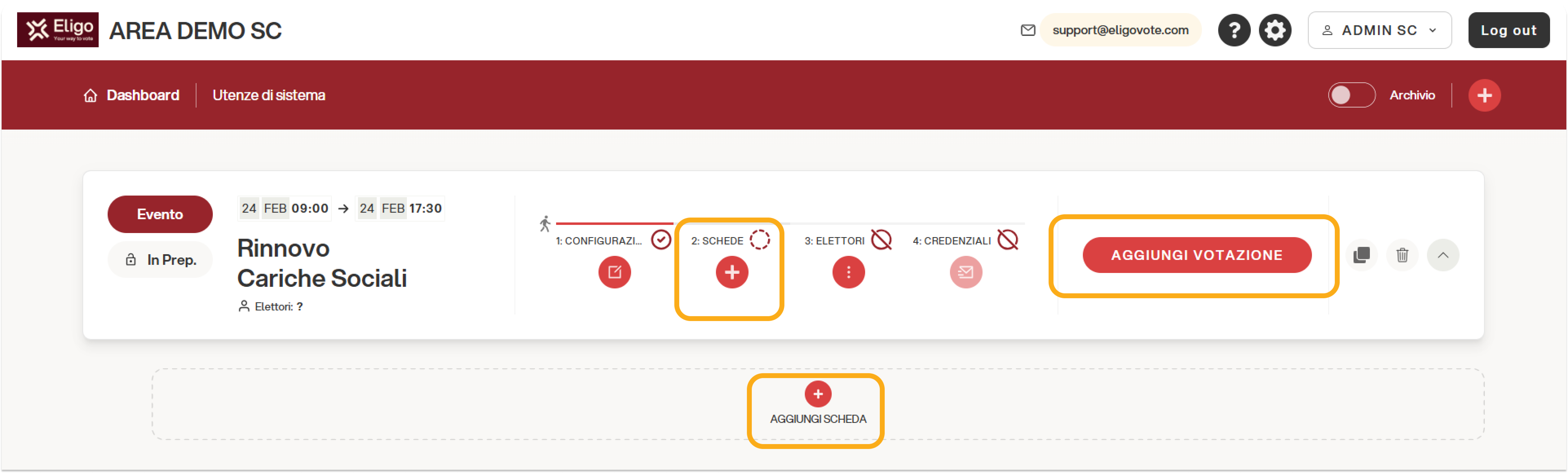 Dalla dashboard del tenant è possibile aggiungere una scheda di voto nella sezione dedicata della finestra di creazione dell'evento elettorale oppure cliccando indistintamente il bottone "+ Schede" nella sezione di riepilogo dell'evento elettorale; il bottone "+ Aggiungi scheda" posto al di sotto dell'evento; il bottone "Aggiungi votazione", se presente, a destra dell'evento: