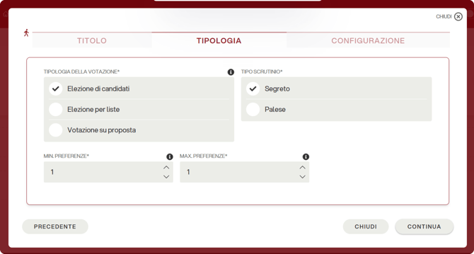 Nella seconda sezione è possibile scegliere la tipologia di votazione, il tipo di scrutinio e il numero di preferenze.